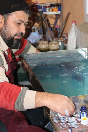 Fırça: Fırçayı kendin yapabilirsin. Mesela ben gül dallarını toplarım. Çünkü gül dalı çok uzun dayanıyor ve çabuk çürümüyor. Bir gül, devamlı suyun içerisinde kalmayıp da kuruduğu zaman iki üç sene gidiyor. Ecdat gül dalıyla yapmış biz de gül dalıyla devam ediyoruz. Fırça yapımında kullanılan at kılları, tercihen yaşlı atların yelelerinden ya da kuyruklarından elde edilir. At kılı tercih edilmesinin nedeni, gözenekleri nedeniyle boyaların fırçadan bir vuruşta dökülmemesidir. Böylece tüm yüzeye eşit büyüklükte ve miktarda boya dökülebilir ve tabanı oluşturur.