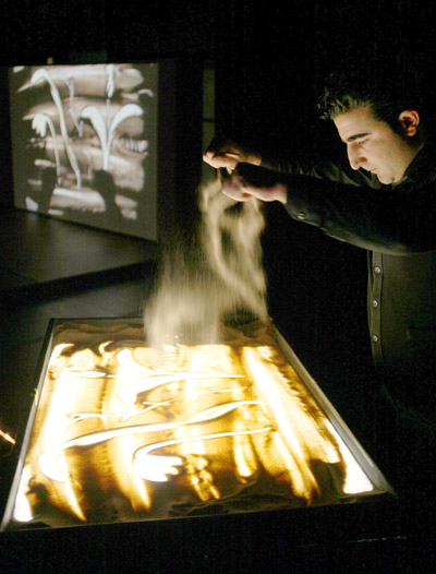Bu teknik biliniyormuş. Fakat onlar tepeden ışıklandırmışlar, biz ışığı altına koyduk tabii ki. Yani dediğim gibi, figüratif-resimsel olarak değil; ama kumla, sonuçta kullanılan malzeme açısından böyle bir şeyin yapılması çok ilginç.